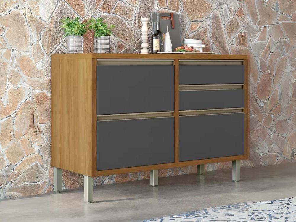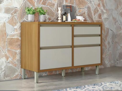 Balcao Nesher Baronesa, Côr Nogal/Branco, da Nesher Móveis, Medidas: Alt 0,93m Larg 1,20m Prof 0,47m, MDF/MDP, com 1 Porta Basculante Articulada com Dobradiça Metálica, 4 Gavetas com Corrediças Telescópicas e Porta Talheres, Puxadores Embutidos de Alúmínio e Pés Plásticos Reguláveis.