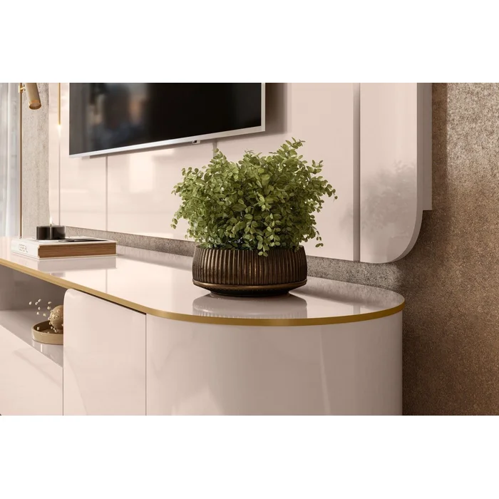 Bancada com Painel Areta, Côr Off White, dfa DJ Moveis, Medidas: Alt 1,89m Larg 2,18m Prof 0,47m Peso 86,15Kg – 3 Volumes – Estrutura 100% MDF – Bancada: Tampo de 25mm Usinado com Bordas Douradas, Cantas Arredondados, 2 Portas de Giro Usinadas com Dobradiças Metálicos com Amortecimentos, 2 Nichos Internos, 1 Gaveta com Corrediças Telescópicas, 1 Nicho Horizontal Externo para Eletroeletrôncios e Pés Metálicos Cilindrícos na Côr Dourada. Painel com Cantos Arredondos, Frisos Decorativos Chanfrados, Luminárias com LED Metálicas Douradas, Espaço para TVs até 75 Polegadas, Suporte Bancada 40Kg/Painel 40Kg e Acabamento em Pintura UV Alto Brilho.