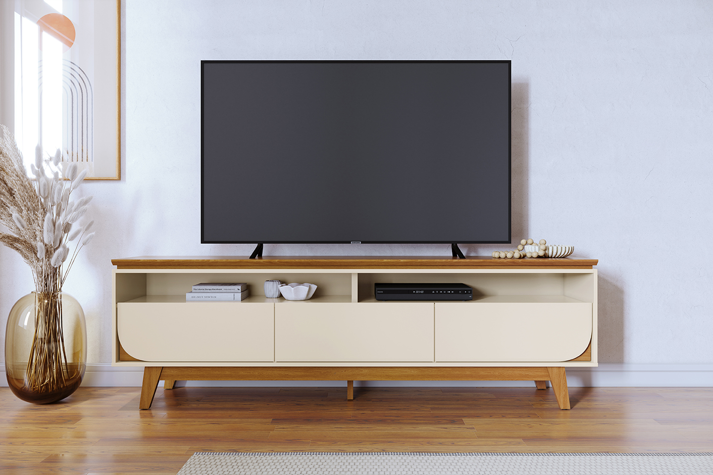 Bancada Selene, Côr Cinamomo/Off White, da Madetec, Medidas: Alt 0,625m Larg 2,00m Prof 0,36m Peso 53,4Kg – 2 Volumes – Estrutura 100% MDP 15mm e 25mm, 3 Gavetas com Corrediças Metálicas Telescópicas, 2 Nichos Externos para Eletroeletrôncios e Objejetos Decorativos, 2 Passa Fios, Tampo com Borda Frontal Chanfrada, Ideal para TVs até 75 Polegadas, suporte Total para até 50Kg. Acabamento em Pintura UV Fosco/Brilho.