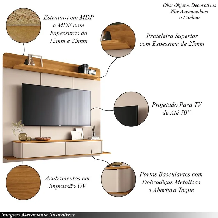 Home Supenso Galax 1.8, Côr Off White/Cinamomo, da HB Móveis, Medidas: Alt 1,65m Larg 1,80m Prof 0,315m Peso 58,25Kg – 2 Volumes – Estrutura MDP e MDF 15mm e 25mm. Bancada com 2 Portas Basculantes com Dobradiças Metálicas e Abertura com Fecho Toque e Cantos Arredondados, e Amplo Espaço sobre o Tampo para Objetos Decorativos e Eletroeletrônicos. Painel com Frisos Decorativos, 1 Prateleira Superior para Itens de Decoração, Espaço Ideal para TVs até 70 Polegadas e Suporte Total para até 40Kg. Acabamento em Pintura UV Brilho/Fosco.