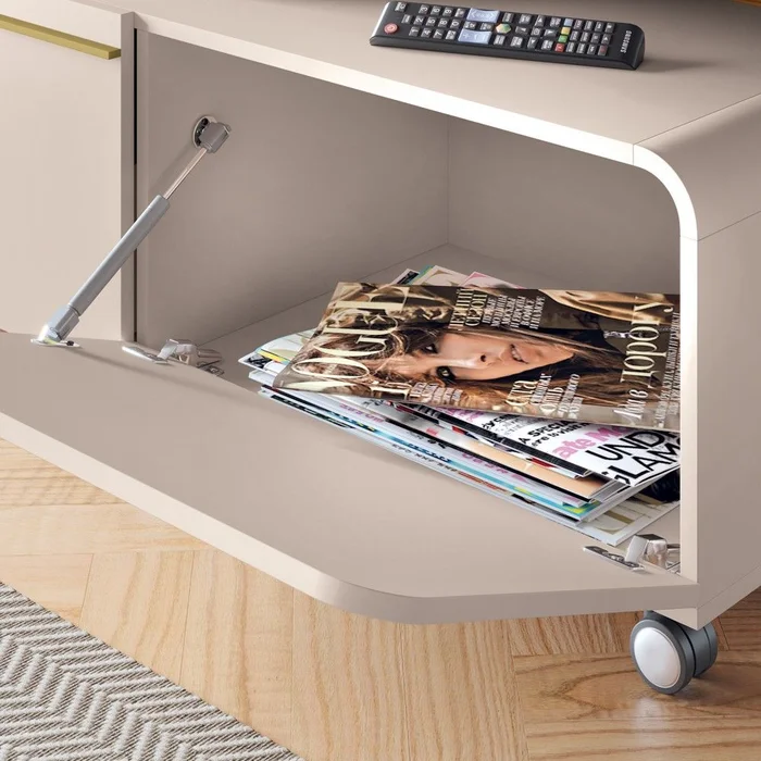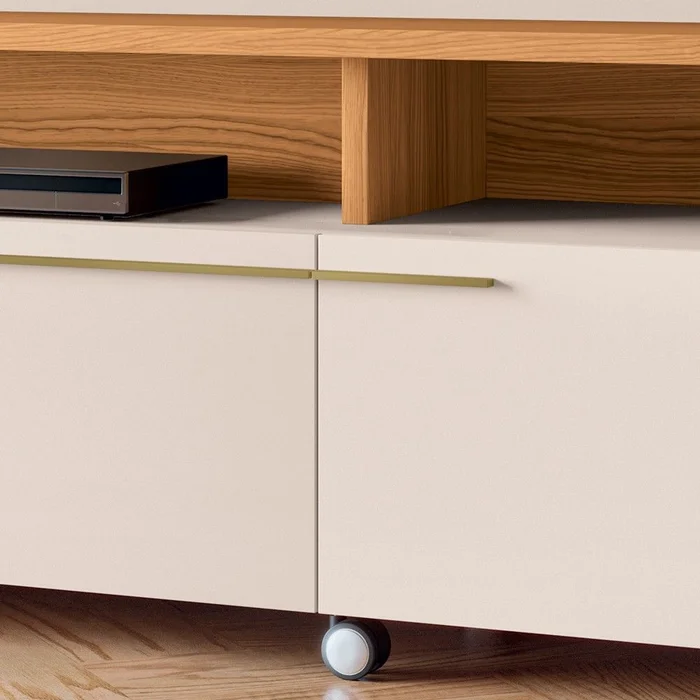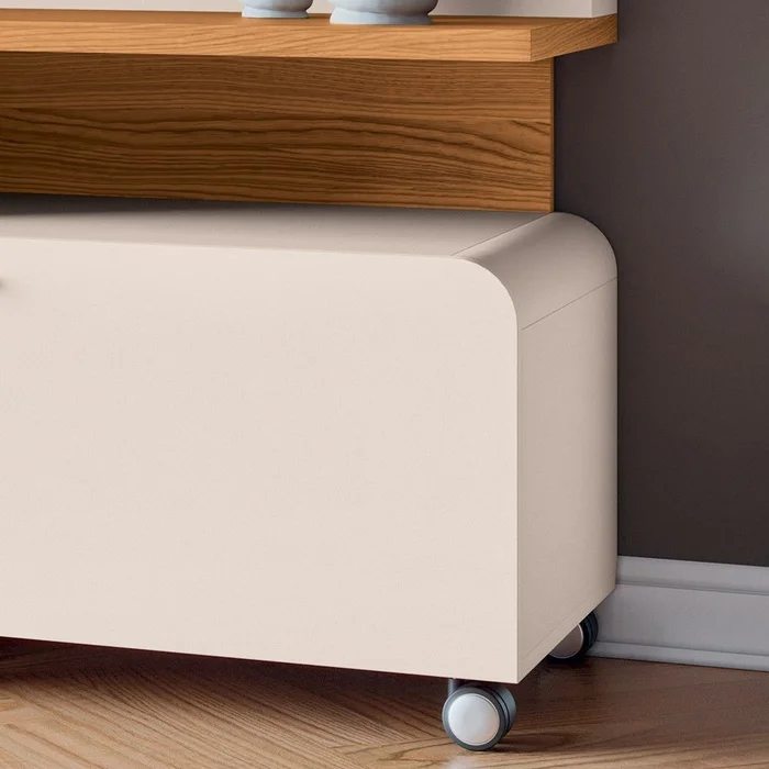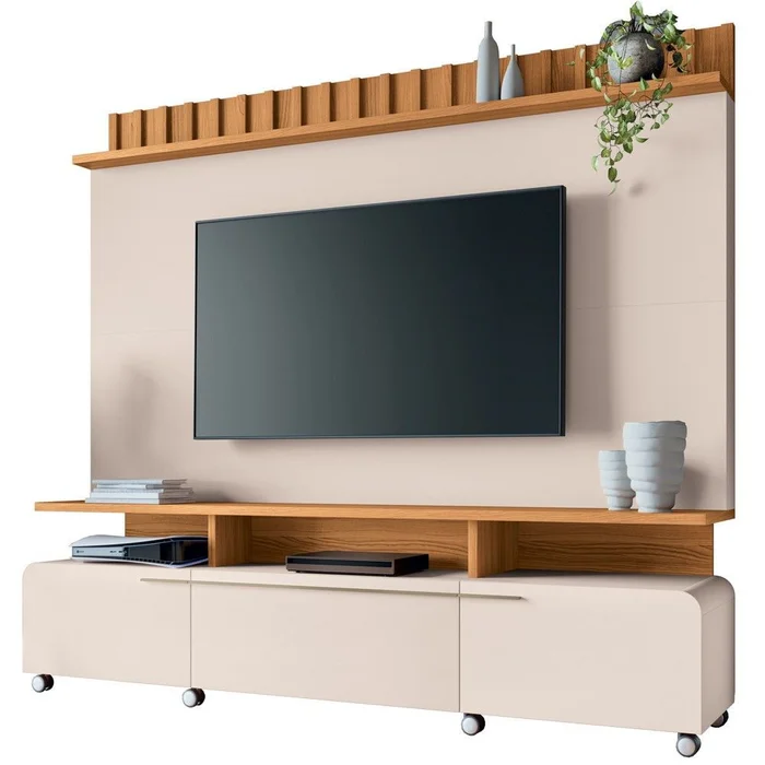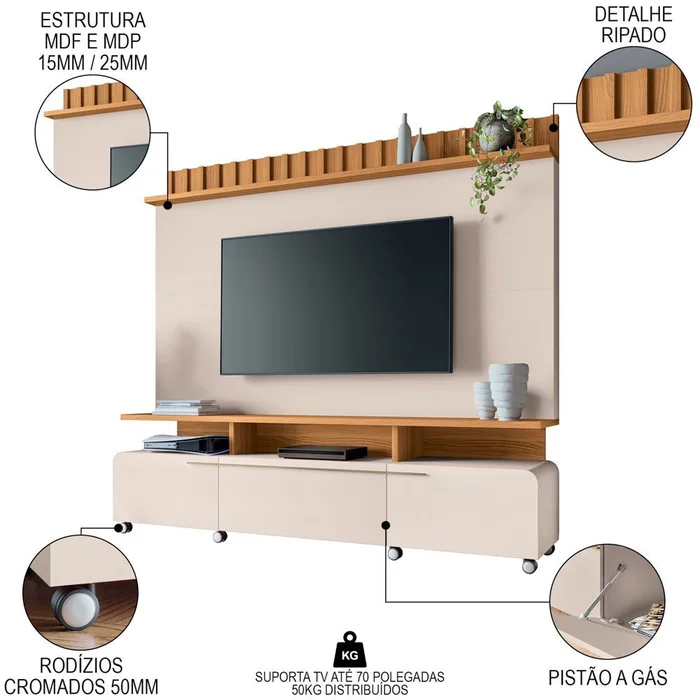 Home Theater Artis 2.0, Côr Off White/Cinanmomo, da HB Móveis, Medidas: Alt 1,805m Larg 2,00m Prof 0,42m Peso 93,68Kg – 2 Volumes – Estrutura MDP/MDF 15mm e 25mm. Bancada com Tampo de Cantos Superiores Curvos, 2 Portas Basculantes com Dobradiças Metálicas e Pistão a Gás, 1 Gaveta com Corrediças Telescópicas, 3 Nichos para Eletroeletrônicos e Objetos Decorativos, Puxadores de Alumínio, Passa Fio e Rodízios Cromados de 50mm. Painel com 2 Prateleiras, sendo uma Inferior e outra Superior para Itens Decorativos, Aba Superior com Detalhes Ripados. Espaço Ideal para TVs até 70 Polegadas e Suporte Total para até 50Kg. Acabamento em Pintura UV Brilho/Fosco.