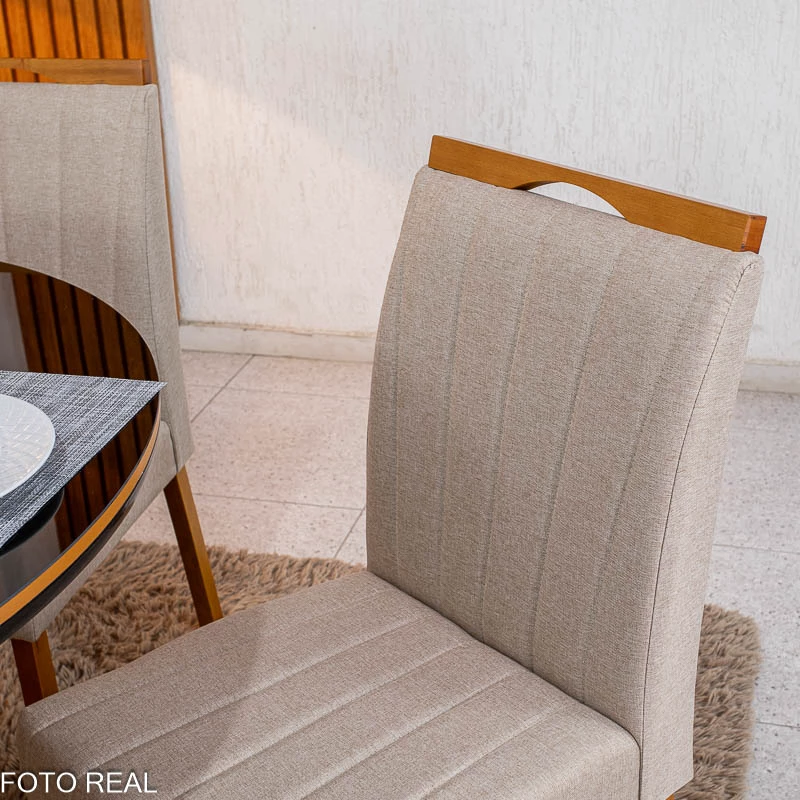 Mesa de Jantar Atlanta Redonda 120cm Base Madeira – Minas Plac + 4 Cad. Isabela Linho Madeira KM Decor – Entregue Montada