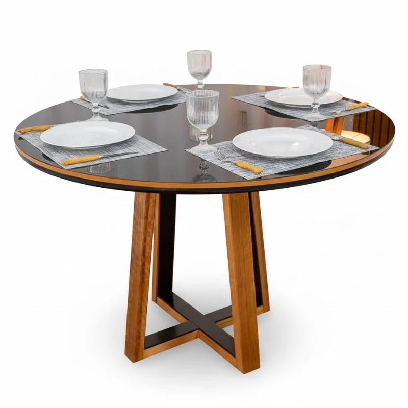 Mesa de Jantar Atlanta Redonda 120cm Vidro Preto/Base Madeira – Minas Plac