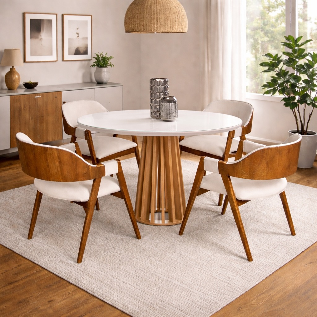 Mesa Berlim 100 Cinamomo/Off White com 4 Pérola Mel Laminado/Linho Areia – CEL MÓVEIS + WJ DECOR
