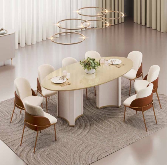 Tampo da mesa dourado chanfrado com MDF 25mm com vidro colado em forma de elipse.