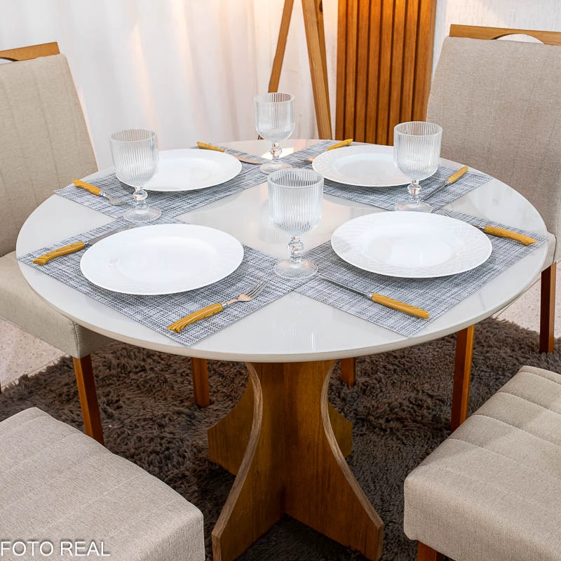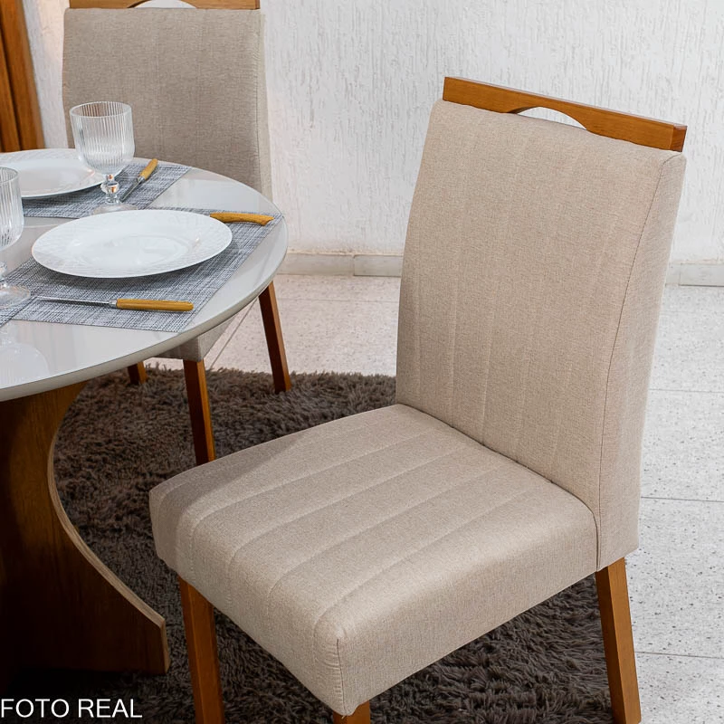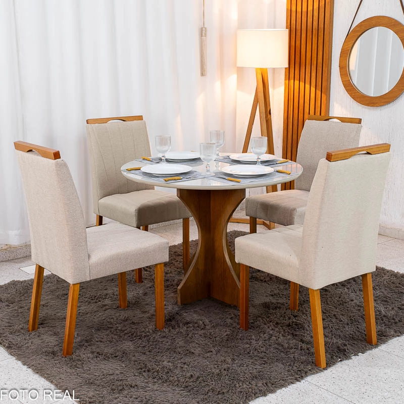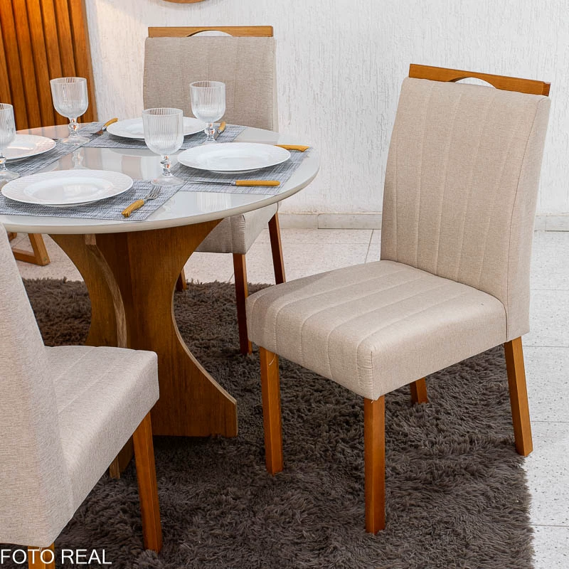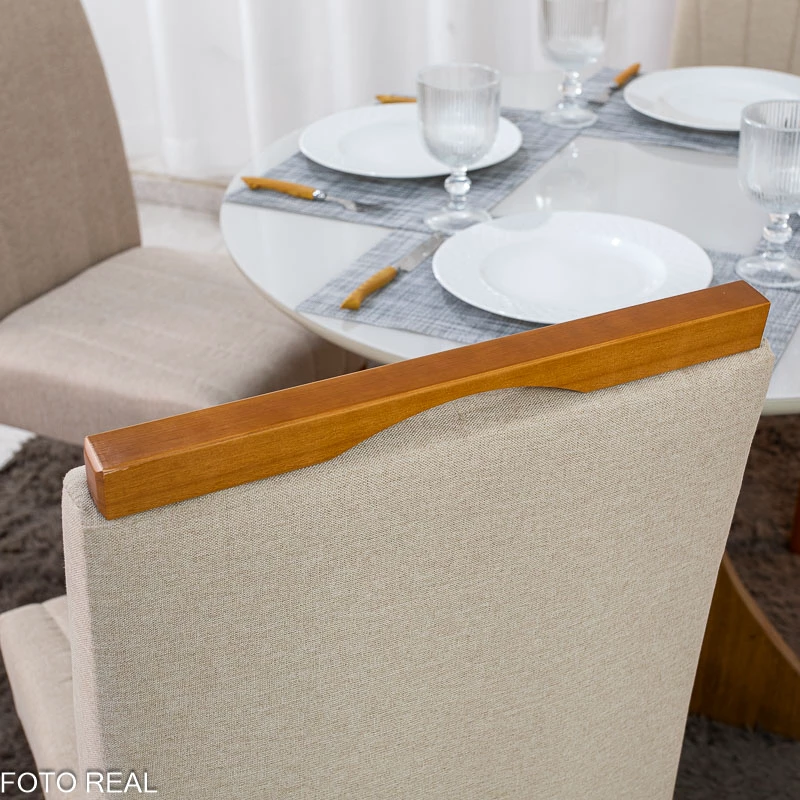 Mesa de Jantar Siena Redonda 100cm Vidro Off/Base Cinamomo – Minas Plac + 4 Cad. Isabela Linho Bege 01 Madeira KM Decor – Entregue Montada