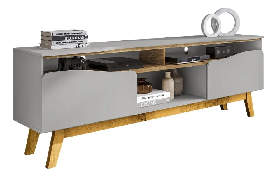 Rack Ilhabella, Côr Off White/Naturale, da Bechara Móveis, Medidas> Alt 0,61m Larg 1,80m Prof 0,38m Pesoso 43Kg – 1 Volume – Estrutura 100% MDP 15mm. Tampos Sobrepostos com Recuo Curvo, 2 Portas de Bater de Formas Orgânicas com Dobradiças Metálicas, 3 Nichos Externos para Eletroeletrônicos e Objetos de Decoração, Pés de Madeia Maciça, Ideal para TVs até 75 Polegadas e Suporte Total para até 70Kg. Acabamento em Pintura UV Brilho.