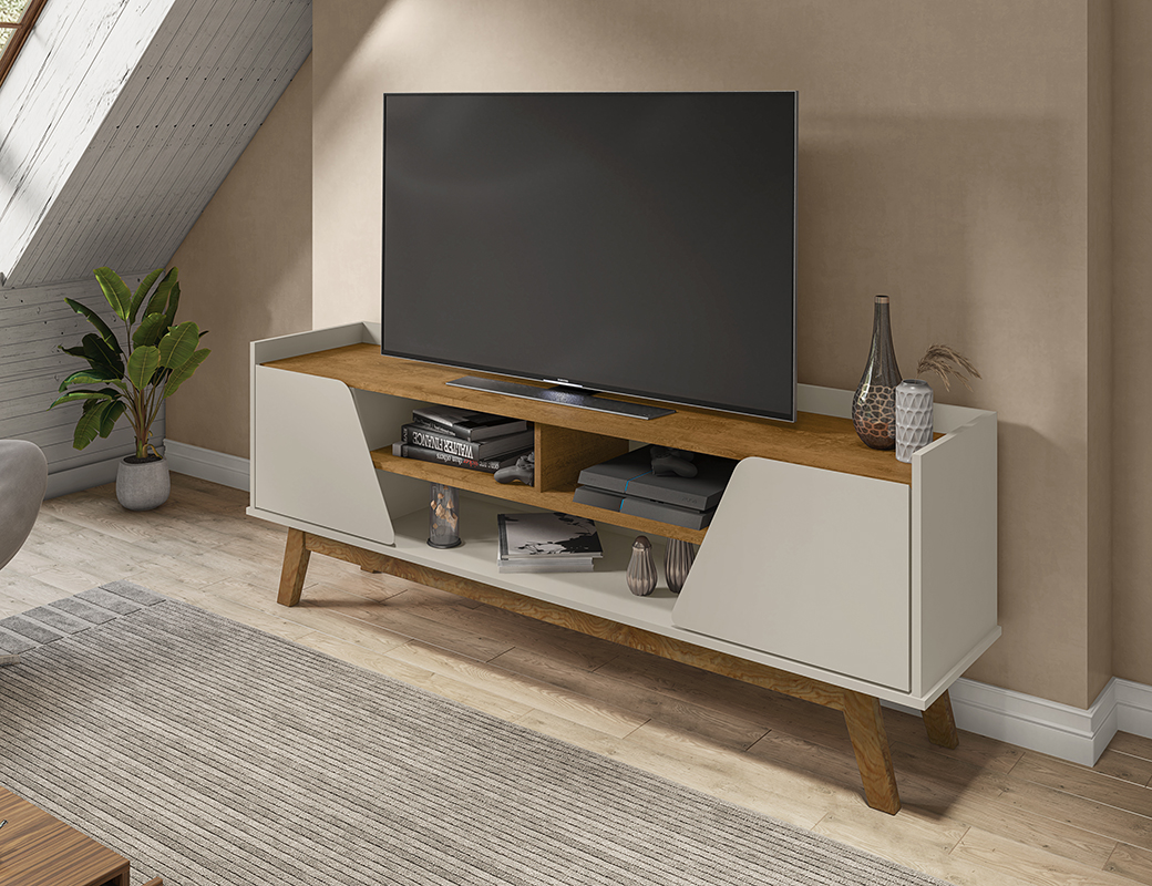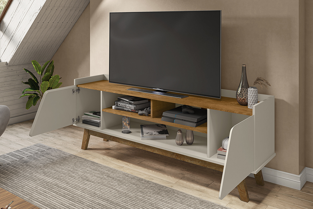 Rack Turim, Côr Off White/Naturale, da Bechara Moveis, Medidas: Alt 0,595, Larg 1,60m Prof 0,36m Pesoso 59,5Kg – 1 Volume – Estrutura 100% MDP 15mm, 2 Portas de Bater de Formas Geométricas com Dobradiças Metálicas Slow Motion, 3 Nichos Externos para Itens Decorativos e Eletroeletrônicos, Passas Fios, Pés de Madeira Maciça, Ideal para TVs até 65 Polegadas e Suporte Total para até 55Kg. Acabamento em Pintura UV Brilho.