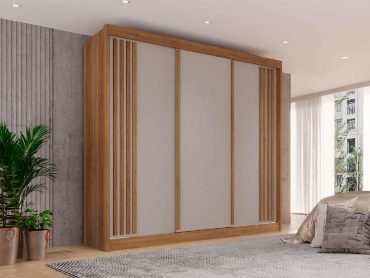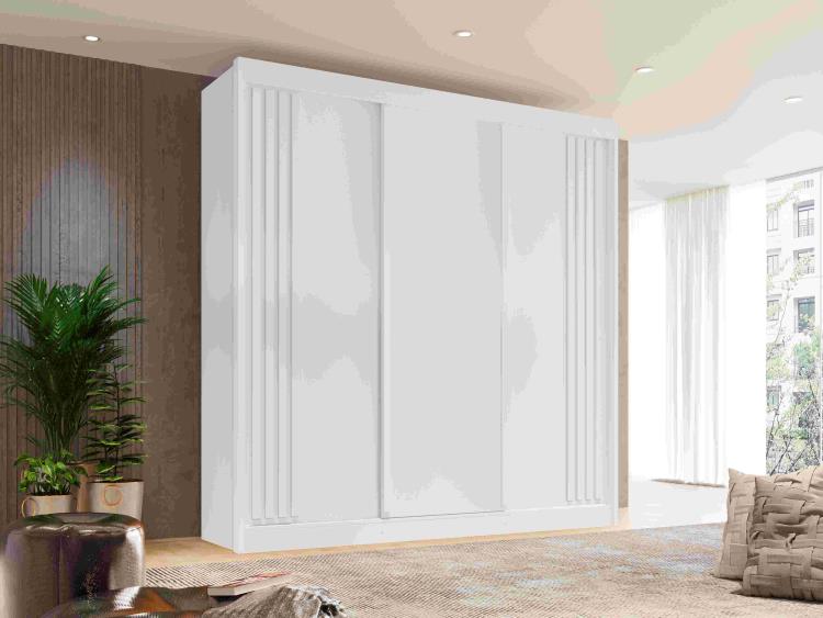 Roupeiro Atenas 3P4G, da Salleto, Medidas: Alt 2,18m Larg 2,20m Pof 0,545 Peso 170,4Kg – 3 Volumes – Estrutura 100% MDF 15mm, 3 Portas Deslizantes com Roldanas de Aço sobre Trilho de Alumínio, sendo que as Portas Laterais possuem Detalhes Ripados, 4 Gavestas com Corrediças Telescópicas, 2 Nichos com Cabideiras de Alumínio, 5 Nichos para Roupas, Malas e Objetos Pessoasis Divididos por 4 Prateleiras, 2 Nichos Sobre os Gaveteiros para Sapatos ou Demais Objetos Pessoais. Acabamento em Pintura UV Semi-Brilho/Brilho. (OBSERVAÇÃO: PRODUTO NÃO ACOMPANHA PÉS, COMO NA FOTO ILUSTRATIVA).