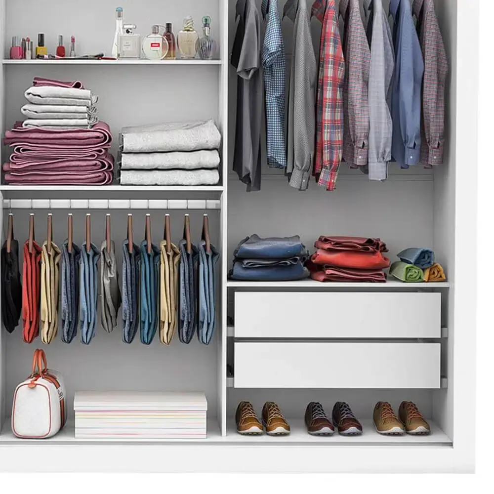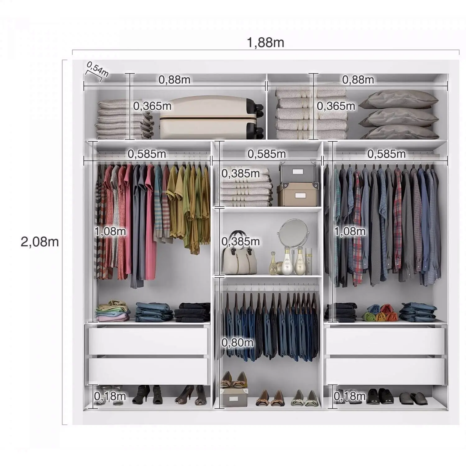 Além do mais, esse belo guarda-roupa possui portas de correr com espelho, trilhos de alumínio para melhor deslizamento das portas, gavetas com corrediças metálicas, puxadores de alumínio e várias repartições internas para alocar melhor suas roupas e pertences.
