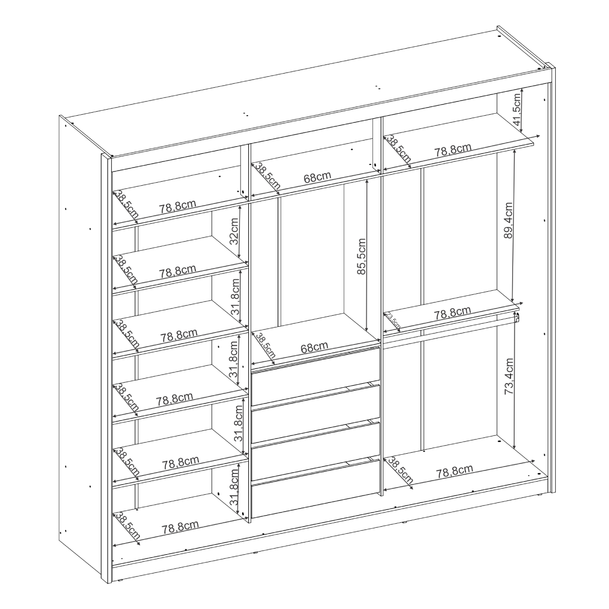 – Quatro gavetas internas com corrediças telescópicas