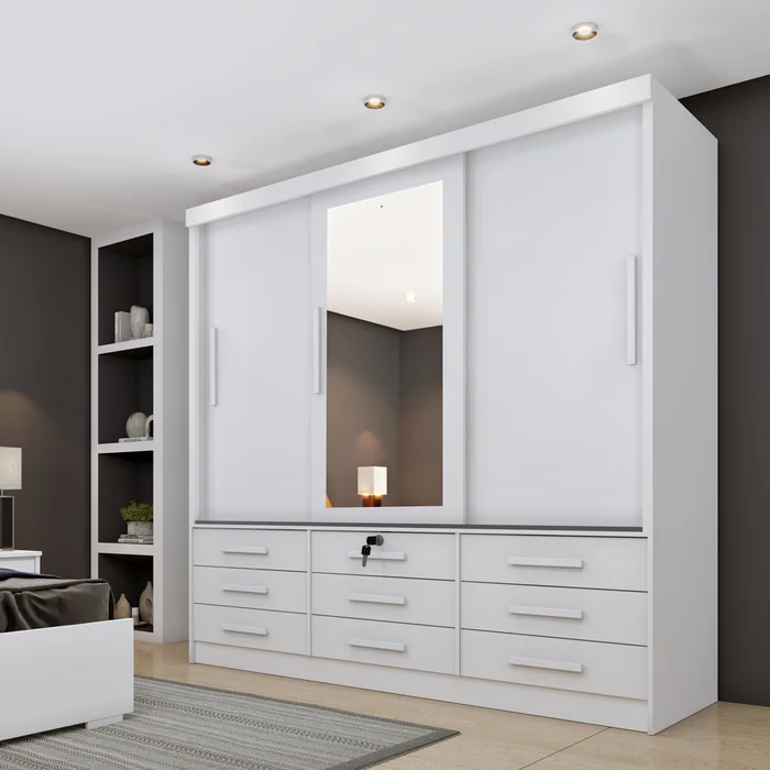 Roupeiro Meridian Plus, da D’Doro Móveis, Medidas: Alt 2,18m Larg 2,00m Prof 0,52m, Estrutura MDP em Chapas de 15mm, sendo Portas, Moldura e Frente de Gavetas em MDF, 3 Portas de Correr sobre Trilhos de Alumínio Antiquedas, 9 Gavetas com CorrediçasTelescópicas, sendo uma com Chaves, 4 Prateleiras, Cabideiro Metálico, Espelho Embutido e Puxadores em PVC Metalizados.