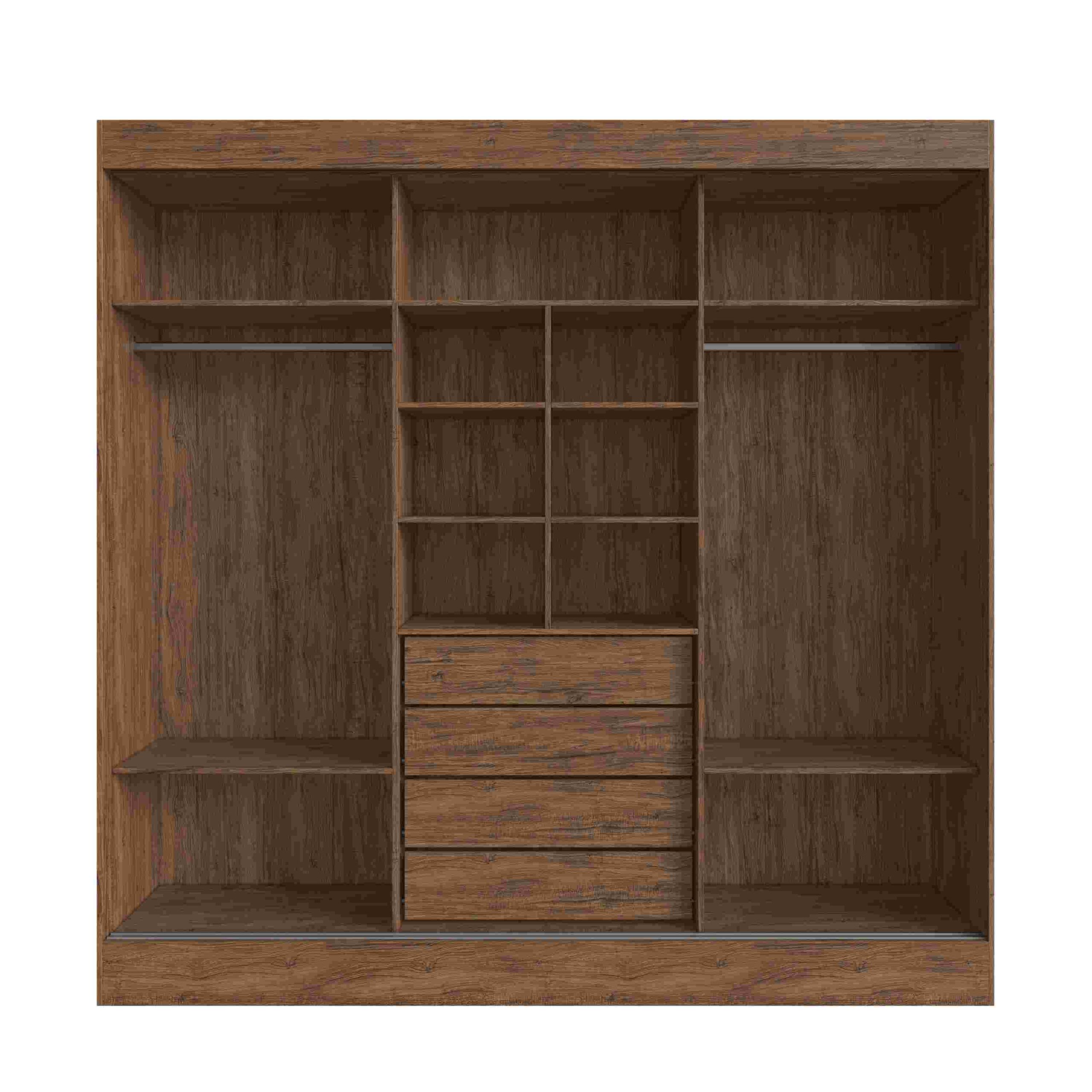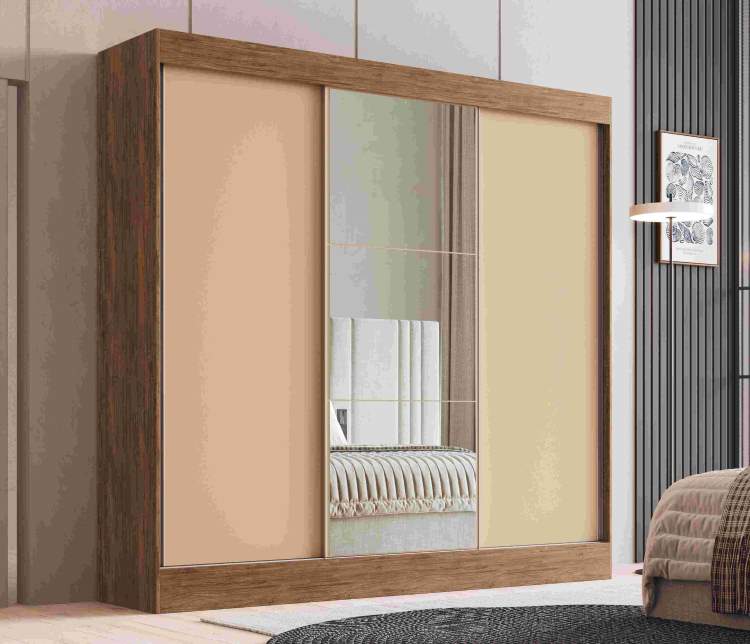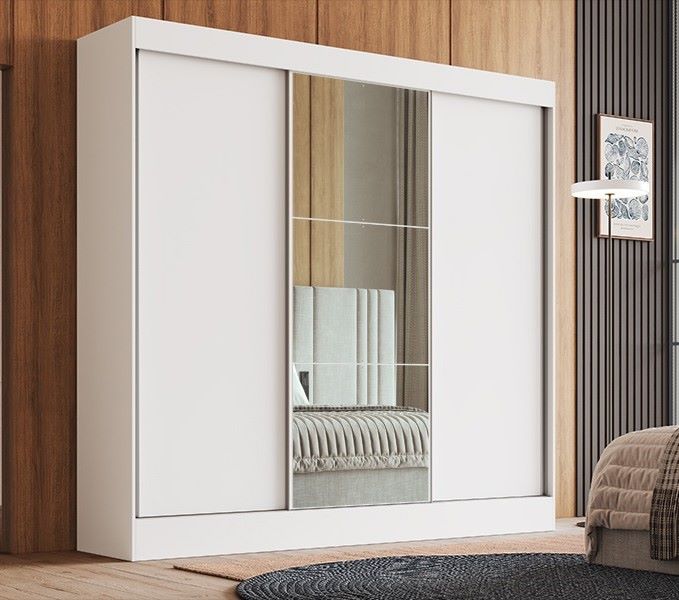 Roupeiro Michigan,  da Doripel Móveis, Medidas: Alt 2,17m Larg 2,30m Prof 0,53m Peso 156Kg – 4 Volumes – Estrutura 100% MDF. 3 Portas Deslizantes com Roldanas Metálicas com Freios, sobre Trilho de Alumínio e Puxadores de Perfil de Alumínio, sendo uma com Espelho Alt 0,745m x 0,65m. Colméia Interior com 4 Gavetas com Corrediças Metálicas Telescópicas, 2 Nichos com Cabideiros de Alumínio, 6 Nichos Centrais para Roupas e Objetos Pessoais, 2 Nichos Inferiores para Sapatos e Bolsas e 3 Nichos Superiores Horizontais para Roupas de Cama, Malas e Demais Objetos. Acabamento em Pintura UV.