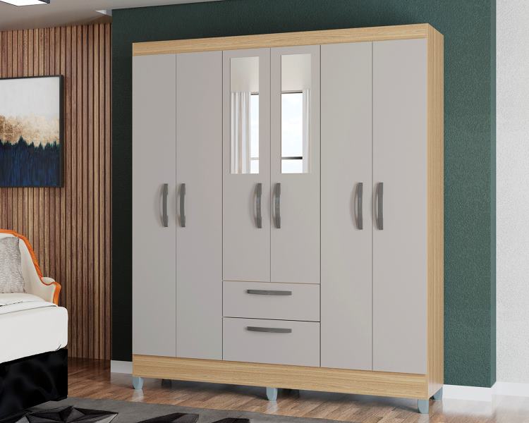 Roupeiro Multi Cancun 6P2G, Côr Damasco/Off White, da Poquema, Medidas: Alt 1,80m Larg 1,48m Prof 0,40m, Estrutura 100% MDP de 12mm, 6 Portas de Bater com Dobradiças Metálicas, sendo as 2 Centrais com Espelhos, 2 Prateleiras Intenas, 2 Gavetas com Corrediças Metálicas, 3 Cabideiros de Madeira, Puxadores e Pés Plásticos Cinza.