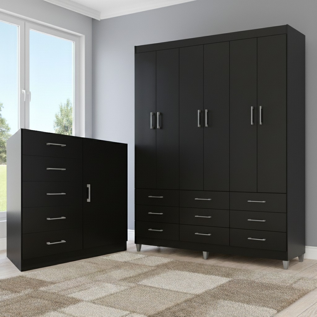 Guarda-Roupa 6 Portas Paraty 3690 + Cômoda 5 Gavetas Sapateira Miami Preto – FELLICCI